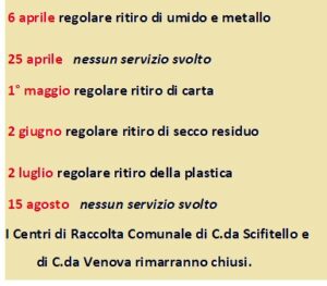 La EcoEnnaServizi S.r.l. informa che in occasione delle prossime festività il programma di raccolta sarà il seguente: